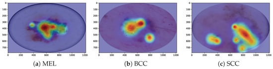We utilize Grad-CAM, a widely recognized visualization tool in research, to elucidate the critical features learned by our HybridSkinFormer model, thereby offering valuable support for subsequent classification decisions. In the visualization process, Grad-CAM first employs gradient calculation methods to generate feature maps for each category. Second, these feature maps are projected onto the original image, facilitating the identification of decision-making regions within the image. Owing to its linear nature, Grad-CAM can be implemented quickly and seamlessly across various neural networks. Finally, unlike methods that utilize “bounding boxes” to indicate the position of specific objects in classification images, Grad-CAM generates a pixel map associated with the target object. This approach yields more accurate, detailed, and high-fidelity visualization results. Figure 17 shows our HybridSkinFormer Model with Grad-CAM visualization technique for the sampled malignant lesion, e.g., MEL, SCC, and BCC. Through the Grad-CAM visualization technique, it can be intuitively observed that our discriminative model is able to accurately focus its attention on the regions with prominent features of malignant lesions.