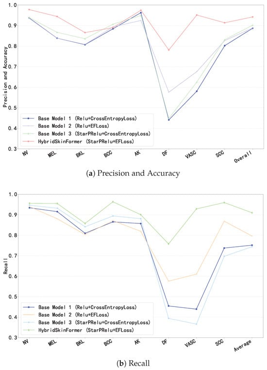 To evaluate the effectiveness of the proposed StarPRelu activation function and Enhanced Focal Loss (EFLoss) function in our proposed model, we conduct the ablation study. We set three base models, Base1 (with traditional Relu activation function and CrossEntropy loss function), Base2 (with traditional Relu activation function and our EFLoss function), and Base3 (with our StarPRelu activation function and CrossEntropy loss function). Figure 18 presents the comparison of precision, overall accuracy, and recall between the base models and the HybridSkinFormer model.