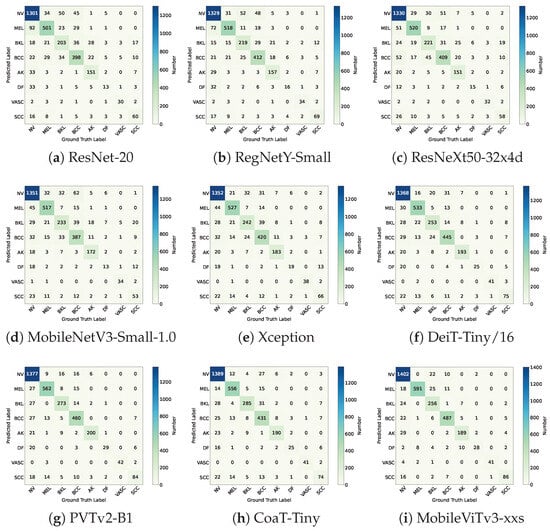The confusion matrices of the compared deep learning models.