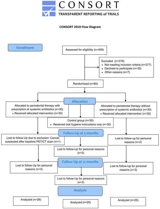 Patients were recruited at the Division of Angiology, Department of Internal Medicine, Medical University of Graz. Key inclusion criteria were a diagnosis of stage III or IV periodontitis according to the 2018 classification [21] and the presence of peripheral artery disease (Rutherford stages 2–4) [22]. Further dental inclusion criteria included ≥12 natural teeth (including third molars), ≥3 teeth with pocket probing depth (PPD) ≥ 6 mm, ≥2 with clinical attachment loss ≥ 5 mm, and bleeding on probing at >20% of sites. A complete list of inclusion and exclusion criteria is provided in the Supplementary File S1. A total of 90 patients were randomly assigned (via www.randomizer.at) into three groups: PT1 (Debridement + Antibiotics): Full-mouth non-surgical periodontal therapy (OSFMD) plus 7-day systemic antibiotics. PT2 (Debridement Only): Full-mouth non-surgical periodontal therapy without antibiotics. Control: No subgingival instrumentation for 3 months. All clinical procedures were performed by a single experienced clinician. As reported previously [20], 5 patients dropped out shortly after enrollment, resulting in a final cohort of 85 patients.