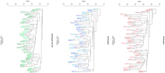 Hierarchical clustering (hclust) of beta-diversity findings across the plaque samples collected from the three study groups. Different shades of the same colors are used for the three collection times. The PT1 group is indicated in green, the PT2 group in blue, and the control group in red shades. The 10-digit numbers across the trees serve as sample identifiers. * describes the average linkage method in hclust.