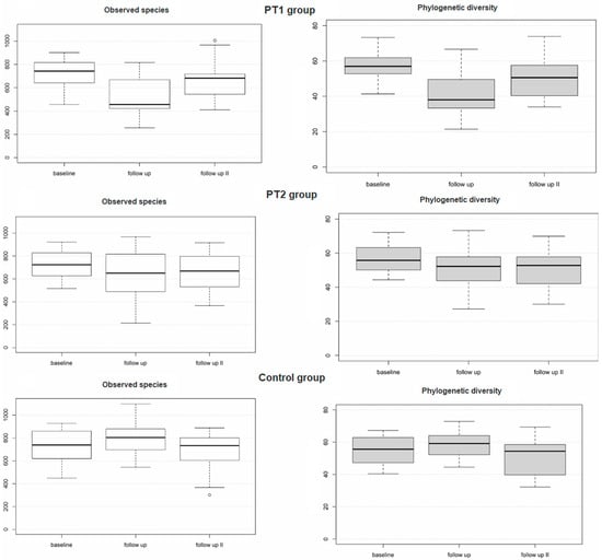 The taxonomic ranks detected over all samples are detailed in Figure 2. As shown in Table 3, the PT1 group revealed highly significant differences from baseline to 3 months for Shannon index (adj. p = 0.000078), observed species (adj. p = 0.000025), and phylogenetic diversity (adj. p = 0.000001). In fact, significant changes in the PT1 group were noted for all alpha-diversity metrics between any of the three collection times, except for two non-significant changes from baseline to 12 months for Shannon index (adj. p = 0.083) and observed species (adj. p = 0.065). The PT2 group revealed no significant changes between the three collection times for Shannon index (adj. p = 0.095) or observed species (adj. p = 0.057). Phylogenetic diversity did significantly differ from baseline both to 3 months (adj. p = 0.005) and to 12 months (adj. p = 0.025) within this group (Table 3 and Figure 3). The control group did reveal significant differences between baseline and 3 months for Shannon index (adj. p = 0.034) and phylogenetic diversity (adj. p = 0.028) but not—between any of the three collection times—for observed species (adj. p = 0.094).