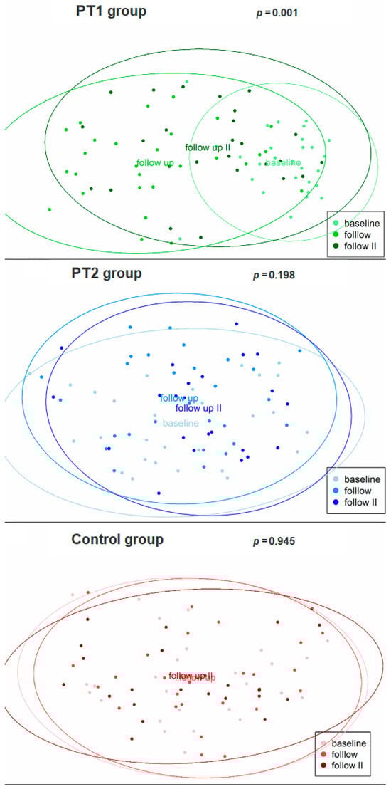 Table 3 also summarizes the results for beta diversity. Significant differences were, both exclusively and consistently, obtained within the PT1 group: from baseline to 3 months (adj. p = 0.003) and 12 months (adj. p = 0.003), and from 3 to 12 months (adj. p = 0.003). This was confirmed by principal coordinate analysis (Figure 4), again disclosing highly significant differences between the three collection times in the PT1 group (p = 0.001) but not in the PT2 or control group (p = 0.198; 0.945). Hierarchical clustering of all samples, too, revealed significant differences in distance along the tree of samples within the PT1 group only (Figure 2).