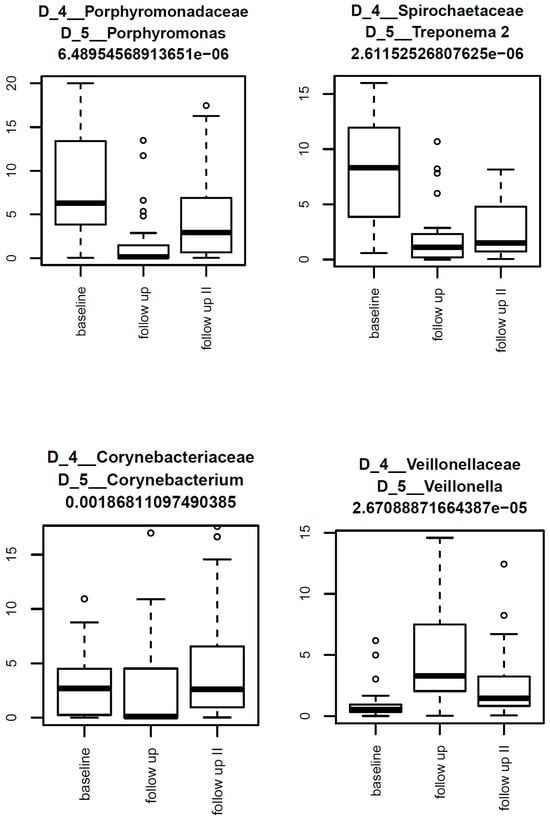 The following supporting information can be downloaded at: https://www.mdpi.com/article/10.3390/diagnostics15162012/s1. The Supporting Information to this article comprises three Excel files. Supplementary File S1: Inclusion and exclusion criteria. Supplementary Figure S1: Hierarchical clustering of all samples in the three treatment groups. Supplementary Figure S2: Box plots of differentially abundant genera found by limma anlysis in the AB group. Supplementary Table S1: Taxonomic ranks detected over all plaque samples from the three study groups. The file includes spreadsheets for phyla, classes, orders, families, and genera. The main phyla were Bacteroidetes, Fusobacteria and Firmicutes; the main genera were Fusobacterium, Porphyromonas, Streptococcus, Treponema 2, and Leptotrichia. Supplementary Table S2: Data of alterations in differentially abundant taxa, based on the plaque samples from the PT1 group. The file includes spreadsheets for alterations from baseline to 3 months, baseline to 12 months, and 3 months to 12 months. At 3 months, the highest abundances over all PT1 samples were seen for Porphyromonas, Treponema 2, Corynebacterium and Veillonella, while the three most abundant genera at baseline had been Porphyromonas, Treponema 2, and Fretibacterium. The highest fold changes were found for an uncultured bacterium of Lactobacillales, Neisseria, Granulicatella, an uncultured genus of Porphyromonadaceae, Desulfobulbus, and unknown genera of Saccharibacteria. Changes from baseline to 12 months were seen for 11 taxa, the most abundant across all samples being Treponema 2, Fretibacterium, and Lautropia. From 3 months to 12 months, 9 taxa were found to remain statistically significant, including Porphyromonas, Corynebacterium, and Tannerella. Supplementary Table S3: Dataset of a ‘random forest feature selection analysis’ of significantly altered taxa, based on the plaque samples from the PT1 group. The differences observed in this group were mainly due to Shuttleworthia, Phocaeicola, Lactobacillus, and Stomatobaculum.