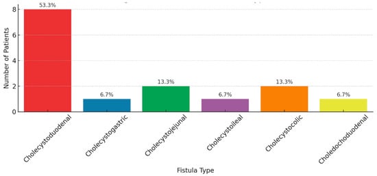 Radiological-pathological analysis of biliary-enteric fistulae showed cholecystoduodenal fistula in eight patients (57.1%), cholecystogastric fistula in one patient (7.1%), cholecystojejunal fistula in two patients (14.3%), cholecystoileal fistula in one patient (7.1%), cholecystocolic fistula in two patients (14.3%), and choledochoduodenal fistula in one patient (7.1%) (Figure 1). Pathological examination confirmed chronic inflammatory changes, epithelial loss, and granulation tissue in all fistula tracts detected on imaging, with a diagnostic concordance rate of 92.8% (13/14 patients). Two patients with recurrence had dense-calcified stones initially and no concurrent cholecystectomy. Logistic regression demonstrated that gallstone size >3.5 cm was a significant predictor of recurrence (OR 2.7; 95% CI: 1.1–6.6; p = 0.038), independent of fistula type.