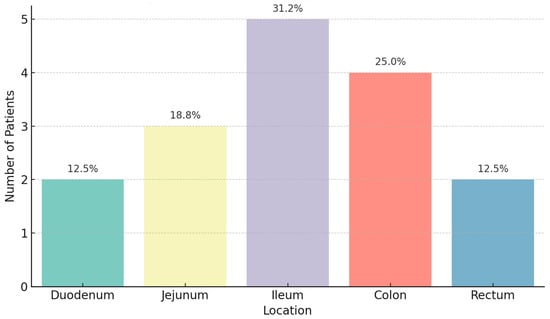 Gallstone impaction sites demonstrated significant variability (p = 0.039, Chi-square test), with impact occurring in different sites: in the duodenum (n = 2, 14.3%), jejunum (n = 3, 21.4%), ileum (n = 5, 35.7%), colon (n = 4, 28.6%), and rectum (n = 2, 14.3%) (Figure 2). Impaction in the ileum was associated with the highest relative risk for bowel wall necrosis confirmed histologically (RR 2.0, 95% CI: 1.1–3.6).