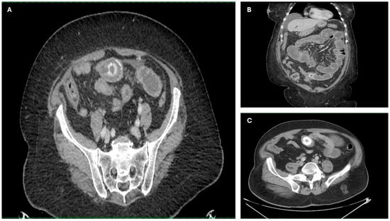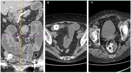 Distal migration of enteric gallstones in biliary ileus. (A,B) Coronal and axial CT images depicting a highly radiopaque enteric gallstone located in the projection of the colon-biliary ileus. (C) Axial CT section showing a radiopaque enteric gallstone in the projection of the rectal ampulla, indicating distal migration—biliary ileus. Acquisition with 5 mm slice thickness and 3 mm reconstruction. Images have been cropped and zoomed for optimal visualization while maintaining the original scale; a 10 mm scale bar is in-cluded in each panel.