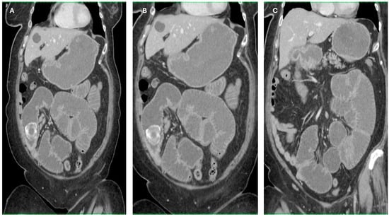 Contrast-enhanced CT is regarded as the gold standard diagnostic tool, boasting high sensitivity (93%), specificity (100%), and accuracy (99%) in identifying gallstone ileus, far surpassing plain radiography or ultrasound []. CT delineates rim-calcified or total-calcified ectopic gallstones, pneumobilia, and the mechanical obstruction characteristic of Rigler’s triad. It also detects biliary-enteric fistulae—most commonly cholecystoduodenal (32.5–96%)—alongside secondary signs like gallbladder wall thickening, collapse, adhesions, and air-fluid levels []. Coronal reconstructions further aid in detecting the often-subtle fistulous tracts.
