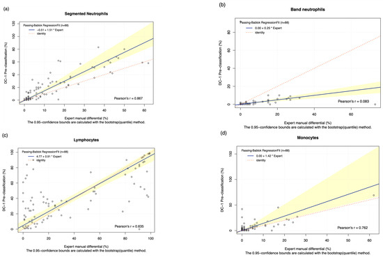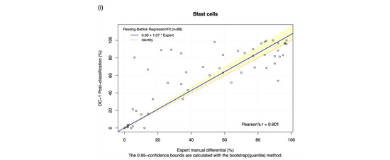 The DC-1 scans of leukaemia peripheral blood smears were manually post-classified and compared with experienced morphologist manual microscopy results using Passing–Bablok and Bland–Altman analysis, with the Bland–Altman graphs displayed in Figure A4. A high estimated accuracy of above 80% was observed for neutrophils, lymphocytes, and blast cells, as well as a very strong correlation with the manual microscopy results for these cell classes, indicated by Pearson’s r coefficient values of greater than 0.9 (Table 2, Figure 2a,c,i). Band neutrophils, monocytes, eosinophils, basophils, metamyelocytes, and myelocytes showed a moderate estimated accuracy of between 54 and 72%. Monocytes, metamyelocytes, and myelocytes displayed a strong correlation strength with the manual microscopy results, with Pearson’s r coefficient values of greater than 0.8. Eosinophils displayed moderate correlation, with an r coefficient of 0.629, whereas band neutrophils showed a relatively weak correlation strength with the manual microscopy results, with a Pearson’s r coefficient value of 0.412 (Table 2, Figure 2b,d,f,g). A low estimated accuracy of less than 30% and a weak correlation strength were observed for promyelocytes, with a Pearson’s r coefficient value of 0.184 (Table 2, Figure 2e). The 95% CI of intercept failed to capture 0 for segmented neutrophils, suggesting the existence of constant bias. The Bland–Altman results revealed that the 95% CI of the mean difference failed to capture 0 for neutrophils, monocytes, promyelocytes, and blast cells, suggesting the existence of systematic bias. A non-linear relationship was observed for basophils, resulting in a failure to detect proportional and constant bias provided by Passing–Bablok analysis.