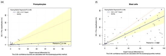 The pre-classification performance of the DC-1 was evaluated through comparison with experienced morphologist manual microscopy results using Passing–Bablok and Bland–Altman analysis, with the Bland–Altman graphs displayed in Figure A3. The results displayed a moderate to high estimated accuracy of above 60% for segmented neutrophils, lymphocytes, monocytes, and blast cells, as well as a moderate to strong correlation with the manual results for these cell classes, with Pearson’s r coefficient values of between 0.6 and 0.8 (Table 2, Figure 1a,c,d,f). A fair estimated accuracy was found for metamyelocytes and myelocytes, with an estimated accuracy of between 50 and 60%. However, low estimated accuracies and negligible correlation with the manual microscopy results were observed for band neutrophils and promyelocytes, with estimated accuracies lower than 31% and correlation coefficients lower than 0.2 (Table 2, Figure 1b,e).