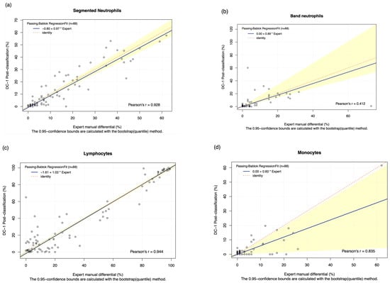 The Passing–Bablok Regression fit showing the correlation and the linear relationship between the DC-1 post-classification (y-axis) and the manual differential (x-axis). (a) Neutrophils, (b) Band neutrophils, (c) Lymphocytes, (d) Monocytes, (e) Eosinophils, (f) Metamyelocytes, (g) Myelocytes, (h) Promyelocytes, and (i) Blast cells. The blue line represented the regression fit line, with the red dotted line showing the ideal agreement line, and the yellow shadow highlighting the 95% CI around the regression line. The Passing–Bablok regression fit for basophils displayed a non-linear relationship and thus were excluded from further analysis. Overall, it showed that Cellavision DC-1 post-classification exhibits satisfactory performance for segmented neutrophils, lymphocytes, monocytes, metamyelocytes, myelocytes, and blast cells.
