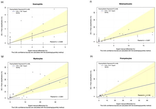Student manual differential vs. medical scientist manual differential. The Passing–Bablok Regression fit showing the correlation and the linear relationship between the DC-1 post-classification (y-axis) and the medical scientist manual differential (x-axis). (a) Neutrophils, (b) Band neutrophils, (c) Lymphocytes, (d) Monocytes, (e) Eosinophils, (f) Metamyelocytes, (g) Myelocytes, and (h) Blast cells. The blue line represented the regression fit line, with the red dotted line showing the ideal agreement line, and the yellow shadow highlighting the 95% CI around the regression line. The Passing–Bablok regression fit for basophils and promyelocytes were not shown due to the non-linear relationship observed.