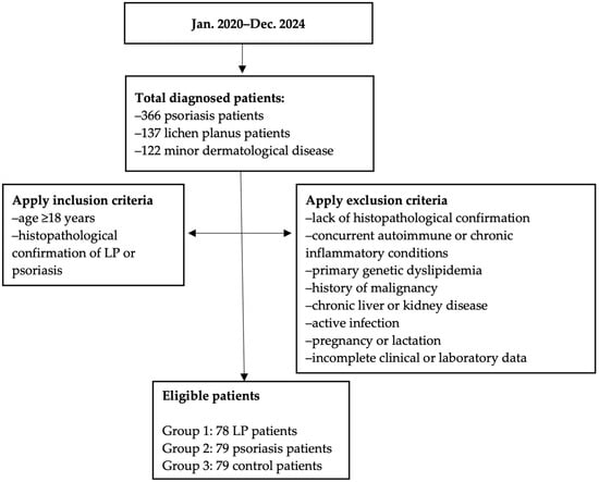 Of the eligible population, 157 participants were included: 78 patients with LP (group 1) and 79 patients with psoriasis (group 2). The control group (group 3) consisted of 79 patients with minor dermatologic conditions (benign tumors, acne, rosacea, tinea unguium) without systemic inflammatory disease. Details of the diagnostic groups included in the study are shown in Table 1.