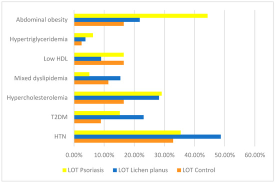 When comparing the LP group to the psoriasis group, statistically significant differences were observed in the prevalence of mixed dyslipidemia and abdominal obesity. Mixed dyslipidemia was more frequently identified in LP patients (75.0%; n = 12/16) compared to those with psoriasis (25.0%; n = 4/16), with a statistically significant association (p = 0.033) and an OR of 3.41 (95% CI: 1.049–11.083), indicating that LP patients were over three times more likely to present with mixed dyslipidemia. Conversely, abdominal obesity was significantly more prevalent in psoriasis patients (67.3%; n = 35/52) than in those with LP (32.7%; n = 17/52), with p = 0.003 and an OR of 0.35 (95% CI: 0.174–0.704), suggesting that LP patients were significantly less likely to exhibit abdominal obesity. No statistically significant differences were found between the groups regarding HTN (57.6% in LP vs. 42.4% in psoriasis; p = 0.092), T2DM (60.0% in LP vs. 40.0% in psoriasis; p = 0.209), hypercholesterolemia (48.9% in LP vs. 51.1% in psoriasis; p = 0.900), low HDL cholesterol (35.0% in LP vs. 65.0% in psoriasis; p = 0.160), or hypertriglyceridemia (37.5% in LP vs. 62.5% in psoriasis; p = 0.719) (Figure 2) (see Appendix A, Table A2).