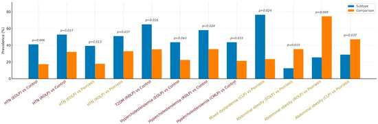 In comparison with psoriasis, HTN remained significantly more prevalent in the ROLP group (50.9%, n = 29/57 vs. 32.9%, n = 25/76; OR = 2.11, 95% CI: 1.04–4.28; p = 0.037), while abdominal obesity was significantly less frequent in ROLP (25.5%, n = 12/47) compared to psoriasis (74.5%, n = 35/47; OR = 0.36, 95% CI: 0.17–0.78; p = 0.009), suggesting a lower risk of visceral adiposity in this subgroup (Figure 3).