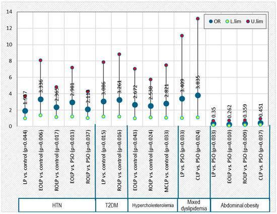 In patients with EOLP, there is an increased risk of HTN compared both with controls (OR = 3.336, p = 0.006) and with psoriasis (OR = 2.981, p = 0.013) and higher risk of hypercholesterolemia (OR = 2.672, p = 0.043) compared with controls (Figure 4).