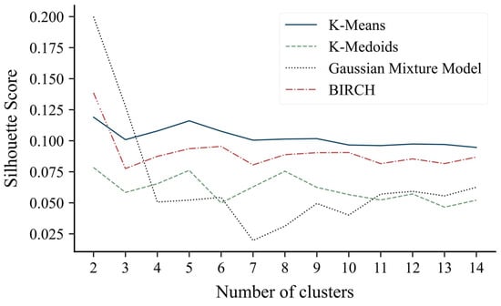 The optimization of the number of clusters conducted for each of the clustering algorithms led to identical results for all: the configuration with two clusters was the one with the highest silhouette score (Figure 2). The silhouette scores for the two-cluster configuration were 0.20 for the Gaussian mixture model, 0.14 for BIRCH, 0.12 for k-means, and 0.08 for k-medoids.