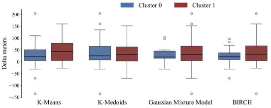 Boxplot representation of Delta meters distribution between the two clusters for each algorithm classification.