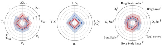 The independent variables of the study were collected at T0 from the three different assessment domains mentioned above, for a total of 26 variables. Specifically, within the FOT, respiratory system resistance (RRS) and reactance (XRS) were measured during inspiration at 5 Hz, along with its variation (ΔXRS). Moreover, inspiratory time (TI), the ratio of TI to total time (TI/TTOT), expiratory time (TE), mechanical ventilation (VE), tidal volume (VT), the percentage of respiratory flow (RF%), and respiratory rate (RR) were recorded. In spirometry, functional parameters were included, such as forced expiratory volume divided by slow vital capacity (FEV/SVC), FEV1, total lung capacity (TLC), inspiratory capacity (IC), functional residual capacity (FRC), and residual volume (VR). During the 6MWT, in addition to recording the total distance walked, patients were assessed from multiple perspectives, including O2 levels, O2 saturation, the Borg Dyspnoea Scale, and the Borg Scale for limb fatigue, measured twice, before and after the test.