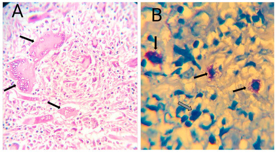 In the orofacial region, primary granulomatous conditions include foreign-body reactions, delayed hypersensitivity to topical agents, and idiopathic orofacial granulomatosis. Secondary causes, on the other hand, are often associated with infectious pathogens, systemic diseases such as sarcoidosis, and inflammatory bowel conditions like Crohn’s disease [11]. Tuberculosis remains a significant global infectious disease despite advancements in healthcare. Tuberculous lymphadenitis is the most common form of extrapulmonary tuberculosis, with a predilection for cervical lymph nodes [12]. The head and neck region may be affected as a secondary site following primary pulmonary tuberculosis or as a primary infection without pulmonary involvement [13,14]. Oral tuberculosis is typically associated with extrapulmonary or disseminated forms, accounting for 0.05–5% of all cases [15]. Histopathological examination commonly reveals caseating necrosis accompanied by Langhans giant cells, while Ziehl–Neelsen staining confirms the presence of acid-fast bacilli [16]. Histoplasmosis, a fungal infection caused by Histoplasma capsulatum, predominantly affects immunocompromised individuals and can present as painful oral ulcerations, often mimicking malignancy [17]. Grocott methenamine silver (GMS) staining highlights fungal elements, and PCR analysis aids in rapid identification [18,19]. Syphilis is a chronic sexually transmitted infection caused by Treponema pallidum (TP) [20]. In its tertiary stage, syphilitic granulomas, known as gummas, can develop, leading to significant tissue destruction, including palatal perforation [21,22]. Foreign materials, such as dental materials and cosmetic fillers, represent a common cause of oral granulomatous disorders [11,23]. These materials exhibit distinct histologic features, enabling their identification with a high degree of confidence [11]. Sarcoidosis is a systemic granulomatous disease that can affect multiple organs, with cervical lymphadenopathy being the most frequent manifestation in the head and neck region. Histopathological examination of lymph node biopsies typically reveals non-caseating epithelioid cell granulomas [24]. Crohn’s disease (CD) is a chronic immune-mediated disorder characterized by an inflammatory process affecting various segments of the gastrointestinal tract, most commonly the terminal ileum and proximal colon [25]. Notably, oral manifestations may precede gastrointestinal symptoms in up to 60% of affected individuals, making early recognition crucial for diagnosis [26].