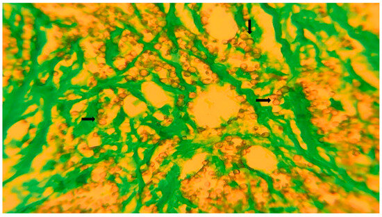 GMS stain showing fungal elements (scale bar = 50 μm, ×400). This photomicrograph demonstrates abundant round to ovoid (black arrows) fungal spores and hyphae stained black or dark brown against a bright green background, characteristic of a positive GMS reaction. The fungal walls are clearly outlined, allowing for the precise identification of morphology.