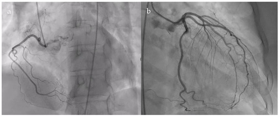 Normal coronary angiogram. (a). Right coronary artery; (b). Left main coronary artery, anterior descending artery, circumflex artery, and collateral branches.