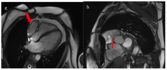 Cardiac MRI. (a). Diastolic view; (b). Systolic view; (c). Early T1 acquisition; (d). T2 acquisition; (e,f). LGE sequences: mid-myocardial contrast uptake with non-ischemic pattern at the interventricular septum and right ventricular insertion junction; (g,h). Right atrium diverticulum (red arrow).