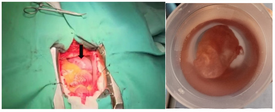 Due to the increased size of the diverticulum and the associated high risk of rupture, the patient was referred to the Cardiovascular Surgery Department, where a successful resection of the lesion was performed (Figure 5). The histopathologic examination confirmed a bistratified wall consisting of a thin endothelium and fibrous tissue with peripheral collagenization, suggestive of a diverticulum. The patient followed the same treatment as before with doses adjusted to clinical and paraclinical data (carvedilol 3.125 mg twice a day, sacubitril/valsartan 24/26 mg twice a day, dapagliflozin 10 mg once a day, spironolactone 50 mg once a day, and rosuvastatin/ezetimibe 40/10 mg once a day).