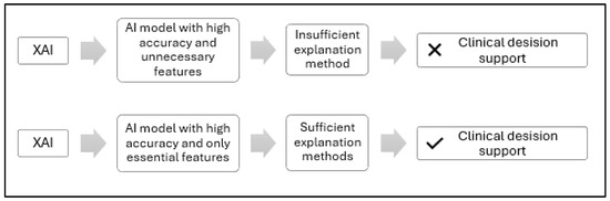 Despite significant advances in the performance of AI models in diagnosing AD, the “black box” problem remains a major challenge in adopting these models in actual clinical contexts. Most deep learning-based models are highly accurate but lack explainability, which undermines physicians’ confidence in their results and hinders their integration into clinical decisions [24,31,32,40,41].