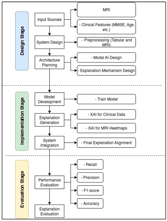 Recent years have seen significant development in the use of AI models for the early detection of AD [18,19,20,21], particularly using MRI data and clinical data, such as the Mini-Mental State Examination (MMSE). Despite the remarkable success in improving the accuracy of predictive models, many of these models rely on deep and complex neural networks [22,23,24,25,26,27,28,29,30,31,32,33], whose decisions are difficult to interpret, reinforcing the “black box” problem in sensitive medical systems [20]. For example, some models have relied on processing all brain segments to extract predictive features [26,28,34], which has complicated the output and made it difficult for non-specialized clinicians to track the logic of decision-making [35].