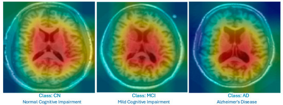 Figure 4 displays the Grad-CAM heatmaps produced by the proposed improved model for each category. The visualizations highlight the lateral ventricles, which are the primary focus areas used by the model for decision-making. These regions correspond to known clinical indicators of AD progression.