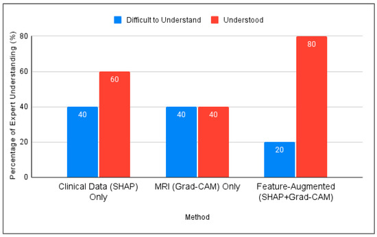 By reviewing [35], our model contributes to addressing several gaps and criticisms raised by this reference. This gap was addressed by developing a Feature-Augmented approach, which combines multiple interpretive tools to present accurate and understandable results for users in real-world clinical settings. Figure 2 illustrates the structure of the proposed Feature-Augmented approach, showing how SHAP-based clinical explanations and Grad-CAM MRI visualizations are combined into a single, integrated interface that enhances both the accuracy and interpretability for clinical decision-making.