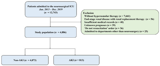 This retrospective observational study was carried out at a single center, the Samsung Medical Center, a tertiary hospital in Seoul, Republic of Korea. It encompassed adult patients admitted to the neurosurgical ICU from January 2013 to September 2019. The Institutional Review Board (IRB) of Samsung Medical Center approved the study (approval number SMC 2020-09-082), and due to its retrospective nature, the requirement for informed consent was waived by the IRB. The study’s criteria included patients admitted to the neurosurgical ICU who received hyperosmolar therapy and had comprehensive initial laboratory tests—serum sodium, chloride, osmolality, urea, glucose, creatinine, glomerular filtration rate (GFR), and arterial blood gas analysis—performed within the first 12 h following ICU admission, along with subsequent follow-up levels. Exclusion criteria were patients below 18 years, those with end-stage renal disease on renal replacement therapy, those with inadequate medical records, a ‘do not resuscitate’ order, admissions to departments other than neurosurgery, transfers to other hospitals, or an uncertain prognosis.