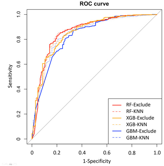Receiver operating characteristic (ROC) curves demonstrating model generalization across different missing data handling approaches. Performance comparison of eXtreme Gradient Boosting (XGB), Gradient Boosting Machine (GBM), and Random Forest (RF) models using exclude (excluding subjects with missing data) and k-nearest neighbors (KNN) imputation approaches. The consistent performance across preprocessing methods demonstrates model robustness and generalization capability.
