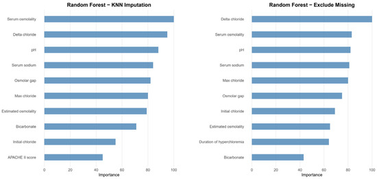 Variable importance ranking for the top 10 predictors in RF models across different preprocessing approaches. The left panel shows variable importance for RF with KNN imputation, while the right panel displays results for RF with missing data exclusion. Both preprocessing methods demonstrate consistent identification of key predictive variables, with delta chloride and serum osmolality emerging as the most important predictors. The magnitude of importance is scaled so that the maximum value is 100. The remarkable consistency in variable rankings between the two approaches demonstrates the robustness of these predictive features regardless of missing data handling methodology, supporting the clinical relevance of these biomarkers for AKI prediction in neurocritical care patients receiving hyperosmolar therapy.