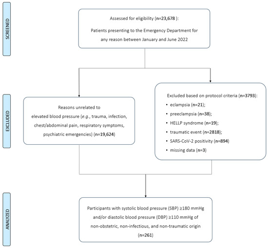 Starting from a cohort of 23,678 individuals who accessed our ED during the study period, 3790 were excluded due to a diagnosis of eclampsia, preeclampsia, or HELLP syndrome; a concomitant traumatic event; or a positive SARS-CoV-2 rapid assay at triage. An additional 19,624 patients presented to the ED for reasons unrelated to elevated BP, including trauma, infections, abdominal or chest pain, respiratory symptoms, psychiatric emergencies, and other non-hypertensive conditions. Thus, during the six-month study period, acute hypertensive disorders of non-obstetric, non-infectious, and non-traumatic origin were diagnosed in 264 individuals, corresponding to an incidence rate of 1.1%. However, three patients were excluded due to a high proportion of missing data relevant to the study objectives, specifically the lack of sufficient clinical information to reliably differentiate between HE and HU at presentation. As a result, 261 patients had sufficient data for analysis, including 115 (44%) with HE and 146 (56%) with HU (Figure 1).