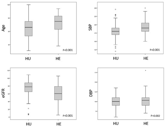 As illustrated in Figure 2, some relevant differences emerged when comparing patients with HU and those with HE. Specifically, the HE patient group was significantly older, with a median age of 75.0 years (IQR: 63.0–83.0) compared with 66.0 years (IQR: 53.0–75.3) in the HU group (p < 0.001). Upon ED presentation, the HE patients also exhibited a significantly higher median SBP (190.0 vs. 180.0 mmHg, p < 0.001) and DBP (103.0 vs. 100.0 mmHg, p = 0.002) compared with the HU patients. While the prevalence of known treated hypertension was similar between the two groups (approximately 76%), the HE patients demonstrated a significantly higher prevalence of diabetes mellitus (35.7% vs. 17.9%, p = 0.002), CAD (27.8% vs. 16.0%, p = 0.030), and CKD (14.8% vs. 4.1%, p = 0.005). Consistent with these findings, the HE patients also had significantly higher median serum creatinine (1.06 vs. 0.85 mg/dL, p < 0.001) and lower eGFR values (60.3 vs. 77.8 mL/min/1.73 m2, p < 0.001).
