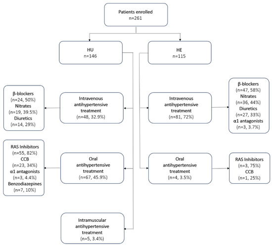 Half of the patients with HU were asymptomatic at the time of evaluation, with nonspecific symptoms observed in the remaining cases, the four main clinical manifestations of A-HMOD among HE patients were acute coronary syndrome, ischemic stroke, hemorrhagic stroke, and pulmonary edema, each occurring in approximately one quarter of the HE population and leading to immediate hospitalizations in most cases (93%). As expected, antihypertensive treatment in the HE group was predominantly administered intravenously, significantly more often than in HU patients (70.4% vs. 32.9%, p < 0.001), whereas oral administration was more frequently employed in HUs (45.9% vs. 3.5%, p < 0.001). Differences were also observed in the classes of antihypertensive drugs prescribed, with renin–angiotensin system (RAS) inhibitors being more commonly used in HU patients (33.7% vs. 2.6%, p < 0.001), while nitrates were more frequently administered to participants with HE (31.3% vs. 13.0%, p = 0.001) (Figure 3).