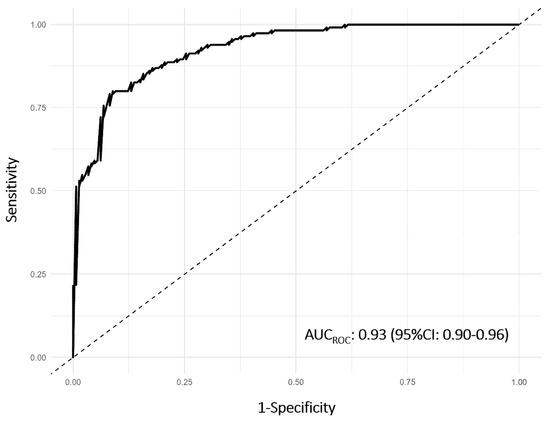 To complement the ordinary regression analysis, a machine learning approach using a RF classifier was also applied, confirming troponin I (IG: 10.22%), age (IG: 7.80%), and SBP (IG: 8.04%) as the most relevant predictors of A-HMOD (Table 2). Overall, the model exhibited excellent predictive performance, with an area under the ROC (AUCROC) curve of 0.93 (95%CI: 0.90–0.96) (Figure 4). An additional analysis using an EN logistic regression further supported the central role of troponin I as the strongest predictor of HE. Among all variables included in the model, troponin I had by far the highest standardized coefficient (β = 4.13), indicating a strong positive association with the outcome. Interpreted on the odds scale, this corresponds to an OR of approximately 62.2 (OR: e.4.13), suggesting that, holding other variables constant, each one SD increase in troponin level was associated with more than a 60-fold increase in the odds of HE. Furthermore, the optimal diagnostic threshold for troponin I, as determined by the Youden index, was identified at 0.12 ng/mL, corresponding to an AUCROC of 0.66 (95%CI: 0.60–0.72), indicating moderate discriminatory ability at this specific cut-off (Supplemental Figure S1).