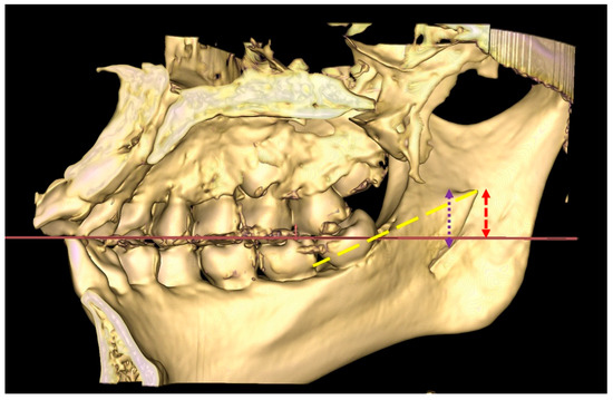 Occlusal plane (OP) as the horizontal reference plane (red horizontal line); distance of lingula tip to M2M, LIM2M (yellow dashed line); HLi (purple dotted arrow); LiOP (red dashed arrow).