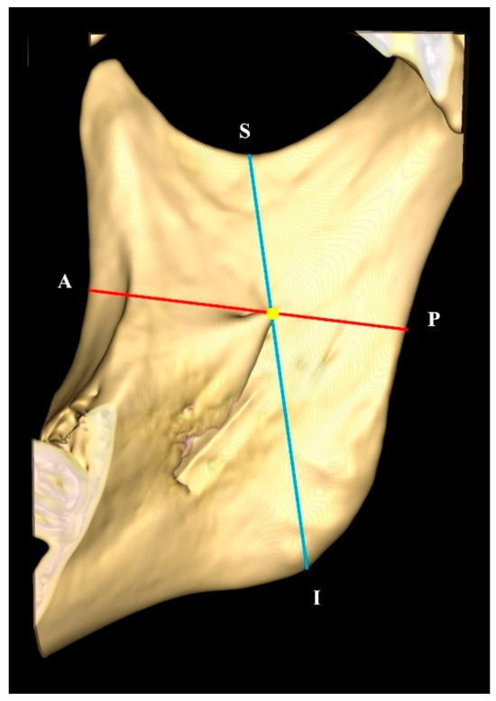 Anatomical landmarks and lingula measurements on the 3D mandibular models. Point A: deepest concavity at the anterior border of ramus. Point S: deepest concavity of the sigmoid notch at the superior border of the ramus. Point P: posterior border of ramus. Point I: inferior border of ramus.
