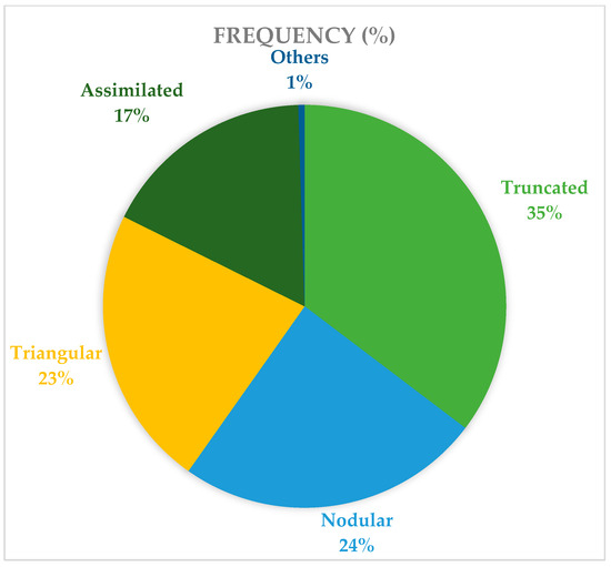 There were no significant differences between the right and left sides (chi-square test; p = 0.962) and between genders. Truncate-shaped ML was the most common appearance, accounting for 146 (35.4%) of the total 412 lingulae studied, followed by the nodular (n = 101; 24.5%) and triangular (n = 93, 22.6%) types, with the least being the assimilated type (n = 71; 17.2%) (Figure 5). There was a fifth morphological variant observed at the right side of the mandible of a Malay male (0.2%). Overall, the truncate-shaped lingula was the most common type of lingula in all ethnic groups (Malay—n = 57; 34.3%; Chinese—n = 68; 34.0%; Indian—n = 21; 45.6%). The chi-square test showed a significant difference (p < 0.05) between ethnicities for the shapes of the lingula on both the right (p = 0.006) and left side (p = 0.02) of the mandible. Bilateral distribution (presence of the same morphological variant on both sides of the mandible) is slightly more than unilateral distribution (Table 4).
