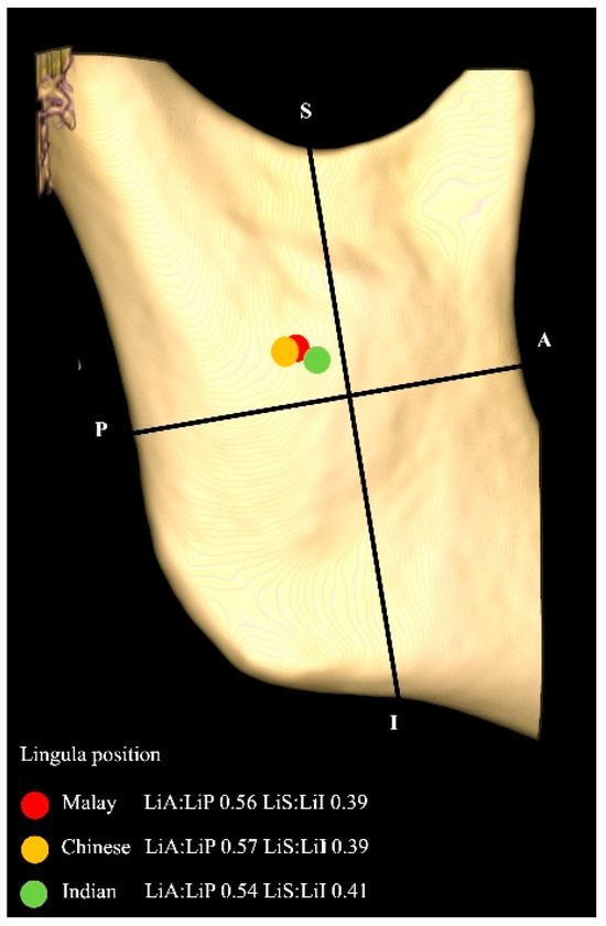 The mean LiA: LiP and LiS: LiI ratios were 0.56 (0.06) and 0.40 (0.05), respectively, with statistical significance between gender but not ethnicity. The LiA: LiP for males (0.54) was higher than females (0.56), suggesting that males have more anteriorly placed lingula in the mid-quadrant.