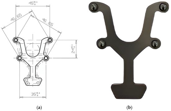 Custom transfer aid with standardized inter-sphere distances: (a) the trapezoid design with four magnetic spheres; (b) the final device with the spheres attached to establish fixed reference distances during the 3D analysis.