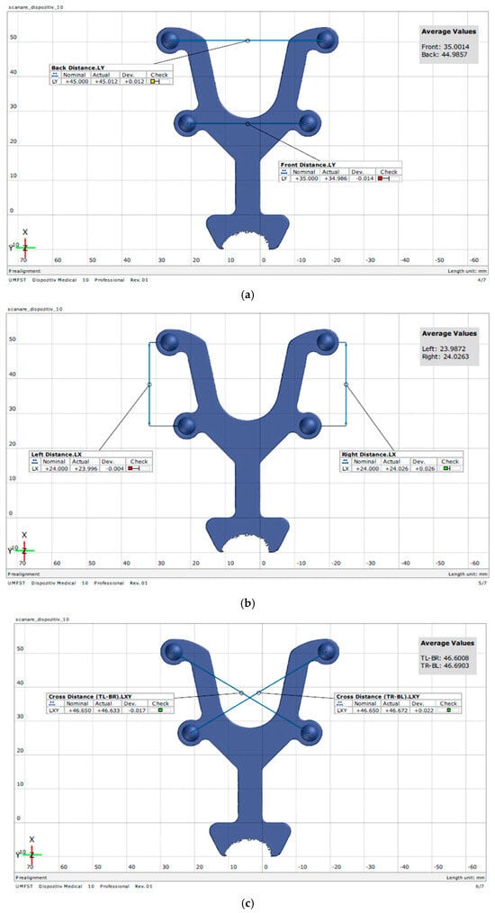 Average mesh of the transfer aid obtained in GOM Inspect software (version 2018): (a) distances in the Y–axis; (b) distances in the X–axis; (c) diagonal distances in the XY–axis.