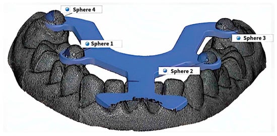 The analog casts were scanned with a GOM Scan 1 structured-light optical scanner (ZEISS GOM GmbH, Braunschweig, Germany). All datasets (intraoral and cast scans) were imported into GOM Inspect software for dimensional analysis. Inter-sphere distances were compared with the nominal reference values defined by the preset spacing between the magnetic spheres in the transfer aid. Meshes from the Medit i700 digital scans and the GOM Scan 1 digitization of analog casts were exported in STL format and imported into GOM Inspect software (version 2018) as mesh objects. The average reference mesh generated during device validation was imported as CAD data. On both the device CAD and each dental-arch scan mesh, geometric elements were fitted to the four spheres, and a reference line connecting the two anterior (frontal) spheres was constructed to standardize orientation (Figure 4). Alignment was carried out by best-fit registration constrained to the spherical surfaces because the Frasaco typodont teeth are not perfectly aligned and, therefore, are unsuitable as a reliable registration geometry. The spheres provide well-defined, mathematically ideal shapes that the dimensional-analysis software can consistently identify.