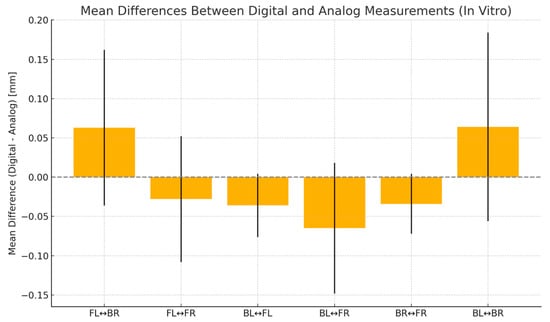 In the in vitro phase, analog impressions demonstrated superior accuracy and consistency compared to digital scans. Only one inter-sphere distance (BL-BR) in the analog workflow differed significantly from the reference (mean discrepancy = 0.053 mm, p < 0.001). All remaining distances showed 95% confidence intervals that included theoretical values, demonstrating negligible systematic error. The mean trueness for the analog casts was 0.019 mm (SD = 0.054 mm), which is well below the 0.1 mm threshold commonly regarded as clinically acceptable. In contrast, the digital workflow (Medit i700) yielded significant differences from nominal values across all six evaluated distances (p < 0.05), with a mean trueness of 0.071 mm and precision ranging from 0.038 to 0.12 mm. Notably, the most pronounced errors occurring over longer spans (BL-BR, BL-FR), consistent with findings in previous studies by Güth et al. and Schmidt et al. [,]. These deviations likely result from accumulated stitching errors inherent to intraoral scanning technology. Notably, ICC values in vitro ranged from poor to moderate for the digital method, supporting the observed variability. These findings suggest that while current digital scanning generally delivers acceptable accuracy for shorter spans, caution may be warranted for extended arch measurements, where accumulated deviation could become clinically relevant.