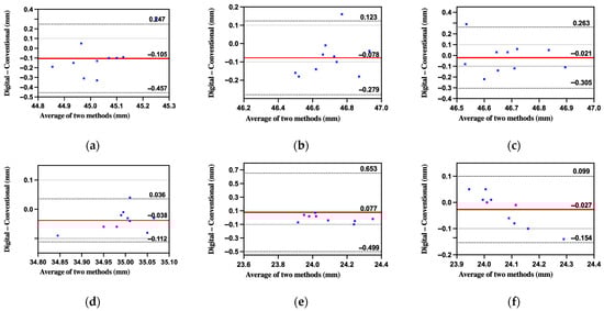Bland–Altman agreement between in vitro digital and conventional impressions for the six inter-sphere spans: (a) BL-BR; (b) BL-FR; (c) FL-BR; (d) FL-FR; (e) BL-FL; (f) BR-FR. Solid red line = mean bias; dashed black lines = 95% limits of agreement; solid gray line = clinical threshold.