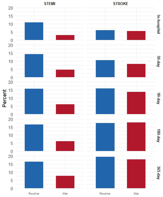 | War vs. Routine (in Stroke) | −171.38 (−513.17, 170.42); p = 0.325 | −19.05 (−39.42, 1.31); p = 0.07 | 14.33 (−9.01, 37.67); p = 0.23 | 0.88 (0.23, 2.86); p = 0.85 | 0.96 (0.32, 2.63); p = 0.94 | 0.89 (0.37, 2.04); p = 0.79 | 1.15 (0.51, 2.50); p = 0.74 | 0.98 (0.44, 2.08); p = 0.97 |