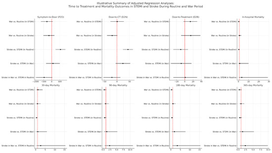 | Stroke in War vs. STEMI in Routine | −466.79 (−971.25, 37.67); p = 0.07 | −19.93 (−53.56, 13.71); p = 0.24 | 1.09 (−27.65, 29.83); p = 0.94 | 3.27 (0.48, 29.07); p = 0.24 | 2.64 (0.53, 15.49); p = 0.25 | 2.37 (0.58, 11.02); p = 0.24 | 3.40 (0.87, 15.48); p = 0.09 | 2.40 (0.64, 9.90); p = 0.21 |